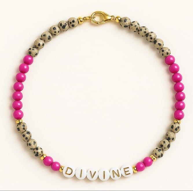 This piece is centered with bold white letter beads spelling DIVINE, symbolizing divine alignment and personal power.